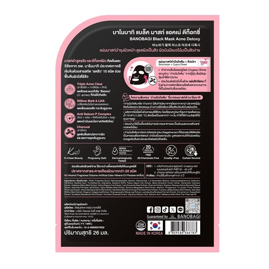 BANOBAGI Black Mask Acne Detoxy was researched and developed by BANOBAGI Hospital, Korea. It is concentrated with 10 types of acne reducing extracts to help clear acne skin and comes with binchotan cupra vegan sheet from Japan. — Triple Acne Clear (Salicylic + Garcinia + Tea Tree) : Reduce acne and bacteria C. acnes that causes acne. — Willow Bark amp; LHA : Reduces acne scars and tighten pores — Anti Sebum P Complex (Pine + Elm + Evening Primrose + Kudzu) : Reduce oiliness and the chance of new acne. — Charcoal : Absorbs dirt from the skin. and reduce clogged pores (gentle for sensitive skin Can be used during pregnancy or breastfeeding. Free from more than 20 types of skin irritants)