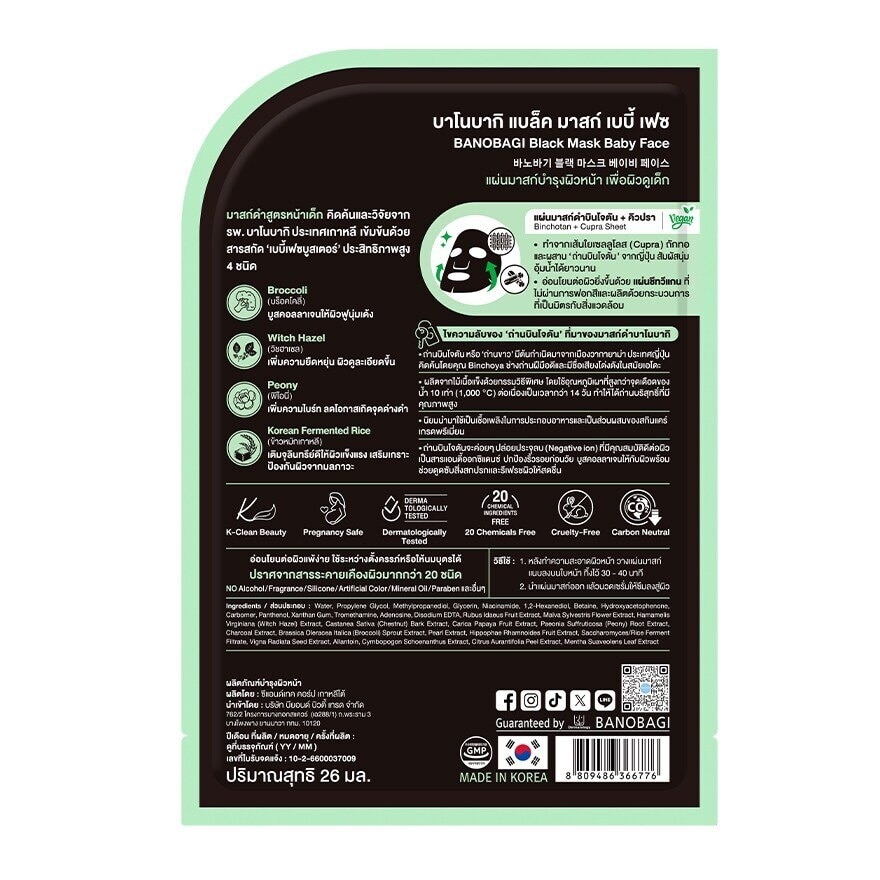 BANOBAGI Black Mask Baby Face was researched and developed by BANOBAGI Hospital, Korea. It is concentrated with extracts 4 types of high efficiency 'Baby Face Boosters' come with Bnchotan Cupra vegan sheet from Japan. — Broccoli : Boosts collagen to make the skin soft and bouncy. — Witch Hazel : increases flexibility. The skin looks more detailed. — Peony : increases brightness Reduce the chance of dark spots. — Korean Fermented Rice : replenishes good microorganisms to strengthen the skin. Strengthen the skin's protective barrier from pollution. (gentle for sensitive skin Can be used during pregnancy or breastfeeding. Free from more than 20 types of skin irritants)