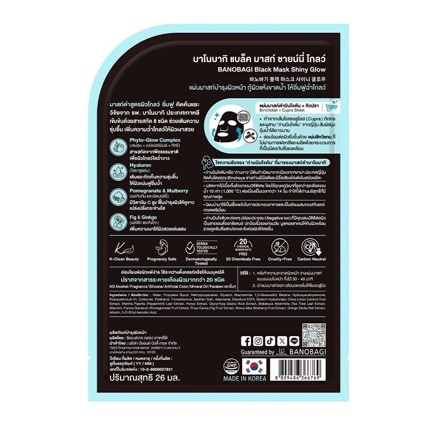 BANOBAGI Black Mask Shiny Glow was researched and developed by BANOBAGI Hospital, Korea. It is concentrated with 8 types of extracts to increase moisturizer levels in the skin and comes with binchotan cupra vegan sheet from Japan. — Phyto-Glow Complex (Lemon + Peppermint + Tea Tree) : Reduce acne and bacteria C. acnes that causes acne. — Hyaluron : Reduces acne scars and tighten pores — Pomegranate amp; Mulberry : Reduce oiliness and the chance of new acne. — Fig amp; Ginkgo : Absorbs dirt from the skin. and reduce clogged pores (gentle for sensitive skin Can be used during pregnancy or breastfeeding. Free from more than 20 types of skin irritants)