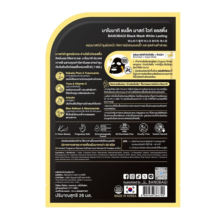 BANOBAGI Black Mask White Lasting was researched and developed by BANOBAGI Hospital, Korea. It combines vitamins and concentrated nutrients White Lasting Complex 7 types. Comes with binchotan cupra vegan sheet from Japan. — Kakadu Plum amp; Tranexamic : Reduces the pigmentation and accumulated dark spots. — Yuzu amp; Vitamin C : Reduces dull skin and exfoliate the skin old skin. — Arbutin : Adjusts the skin tone to look evenly white all over the face. — Blue Balloon amp; Niacinamide 50,000 ppm : Restores dull, dark skin from sunlight and pollution. (gentle for sensitive skin Can be used during pregnancy or breastfeeding. Free from more than 20 types of skin irritants)