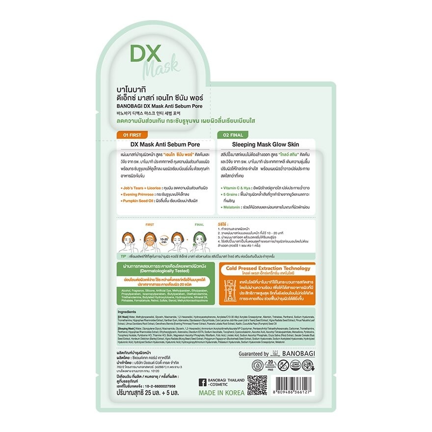 BANOBAGI DX Mask Anti Sebum Pore with sleeping mask Glow Skin researched and develop by BANOBAGI Hospital, Korea. It is fill with nourishing and effective ingredients that help to Control excess oil , tighten pores to look smaller and reveal smoother skin. Job's Tears + Licorice oil control and reduce excess oil on the skin. Evening Primrose tightens pores to be smaller Pumpkin Seed Oil adjust the skin to be smooth and pleasant to the touch. Banobagi DX Mask Anti Sebum Pore and Sleeping Mask Glow Skin fill with nourishing ingredients which are Job's Tears, Licorice, Evening Primrose, Pumpkin, and Seed Oil that help to Control excess oil , tighten pores to look smaller and reveal smoother skin.