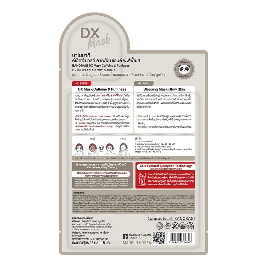 BANOBAGI DX Mask Caffeine and Puffiness with sleeping mask Glow Skin researched and develop by BANOBAGI Hospital, Korea. It is fill with nourishing and effective ingredients that help to reduce swollen skin from sleepless or other factors to be full, fresh all over the face and around the eyes with Triple Caffe (Caffeine + Coffee + Cocoa) highly concentrated caffeine help to revitalizes damaged skin all over the face and reduce puffy skin and dark eyes circles. 9 Peptides 9 types of peptides increase flexibility to make your skin tight and firm. Astaxanthin boosts collagen production to make the skin bounce and plump.