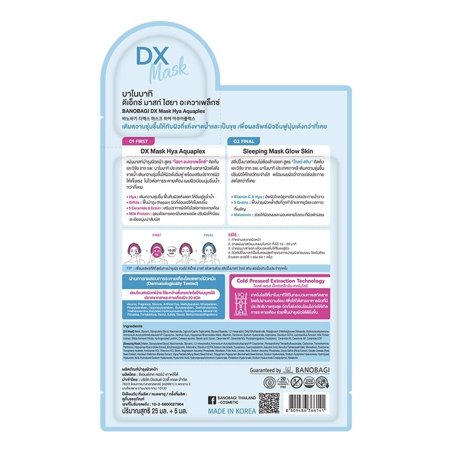 BANOBAGI DX Mask Hya Aquaplex with sleeping mask Glow Skin researched and develop by BANOBAGI Hospital, Korea. It is fill with nourishing and effective ingredients that help to increase moisture, strengthen the skin's barrier result in bouncy skin full, smooth and full of water. Hya replenish moisture to dry to be fluffy and juicy skin Bifida repair the weak skin to be stronger. 5 Ceramide and Ectoin strengthens the skin barrier to prevent irritation. Milk Protein rich in many amino acids and adjust the skin to be smooth, delicate, soft to the touch.