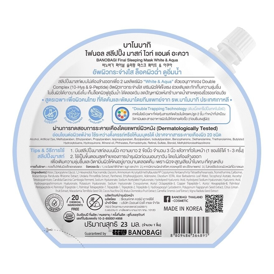 Banobagi Final Sleeping Mask White & Aqua is filled with Double Trapping technology and effectively ingredients that are nutritious and effective to promote skin healthy. It contains Double Complex (10-Hya & 9-Peptide) to attract and hold moisture to your skin. Uneven texture and fine lines will appear diminished and your skin will look brighter, healthier and more youthful with every application. Skincare for Thais, formulated by BANOBAGI hospital dermatologist from South Korea. Safe for sensitive skin, Fragrance, No Silicone and 20-Chemical Free