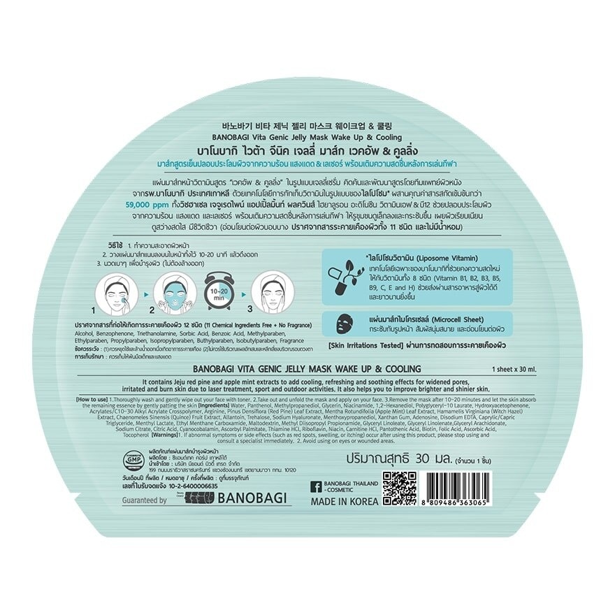 Banobagi Vita Genic Jelly Mask Wake Up & Cooling Liposome Vitamin jelly sheet mask is filled with ingredients that are nutritious and moisturizing. It contains Witch Hazel, Jeju red pine and apple mint extracts to add cooling, refreshing and soothing effects for widened pores, irritated and burn skindue to laser treatment, sport and outdoor activities.It also helps you to improve brighter and shinier skin. 1. Thoroughly wash and gently wipe out your face with toner. 2. Take out and unfold the mask and apply on your face. 3. Remove the mask after 10-20 minutes and let the skin absorb the remaining essence by gently patting the skin.