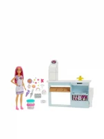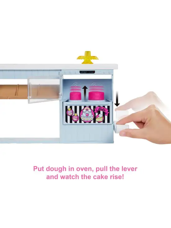 Explore the experience of running a bakery with the Barbie Bakery Playset! Kids love baked treats and with this playset, they can run a bakery and make yummy cakes and other treats! The playset includes Barbie bakery petite doll (12 inches) with cool pink hair dressed in a cute striped dress with a smock. The bakery station has three play areas to bake, decorate and display plus comes with 20+ accessories for storytelling fun. Kids can use two kinds of dough (pink or blue) and put it in the oven, pull the lever, and watch the cakes rise for cake making fun! They can then decorate the cake on the pedestal and use cake decorating accessories and toppers to design the cake exterior. Playset includes bakery station, Barbie 12 inch doll, 2 dough containers, piping bag stamper, spatula, decorations, toppers, cupcake tin, cookie plate, and more. Barbie dolls can hold some of the accessories for even more realistic play fun. Doll cannot stand alone. Colors and decorations may vary. Makes a great gift for ages 3 years old and up.