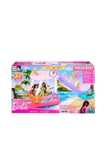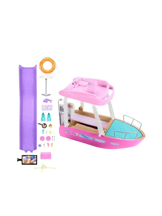 Make waves with the Barbie Dream Boat! This playset is decked out with premium details like a pool, slide, two different transformations, and so much more. Barbie doll can climb to the top deck to steer the boat and relax in the sun, then slide down into the pool! Kids can even remove the top deck for easy play access. Doll not included. There are 6 play areas include a bathroom, sun deck, pool and slide, bedroom, kitchen and living room. Transform the living room and kitchen into a bedroom and bathroom in just a few seconds! This Barbie boat comes with 20+ pieces! There are water-themed accessories like fins and a snorkel, as well as fun extras like an underwater camera, food, drinks and even a boombox.