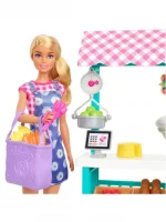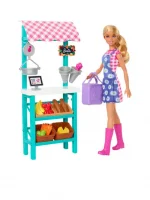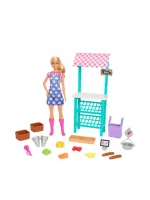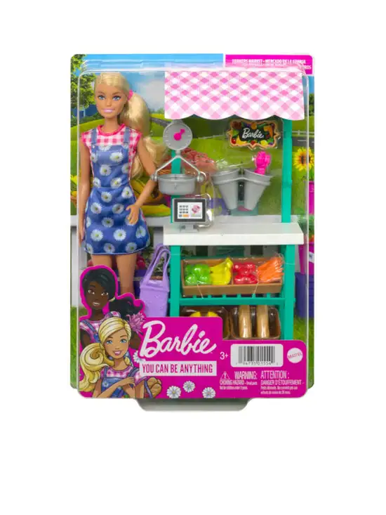 Fun with the Barbie Farmers Market Playset. The Barbie doll wears an adorable gingham print dress with a flowered smock plus tall pink boots and is ready to help her customers. The market stand has a gingham print cabana top and has shelving with two baskets that hold the fruits, vegetables, cheese, and bread. There’s also a flower container to hold flowers for sale, too. Barbie doll can weigh produce on the scale with a real moving dial, bag it for her customers and ring it up at the register. For ages 3 and up.