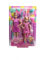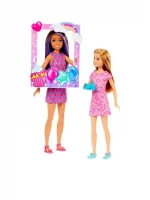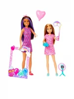 Barbie sister skipper and stacy sister set will start shooting with a festive party themed photo frame with camera and photo props. Includes photo frames, rainbow eyeglass props, balloons, shooting stand with ring lights, smartphones, cameras, and other accessories The skipper and stacie are dressed in a gorgeous printed dress and has a handle to insert the doll’s hand