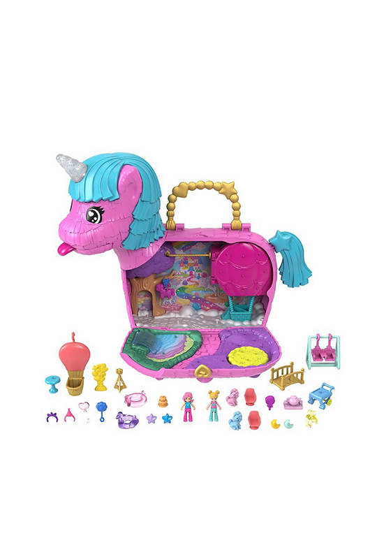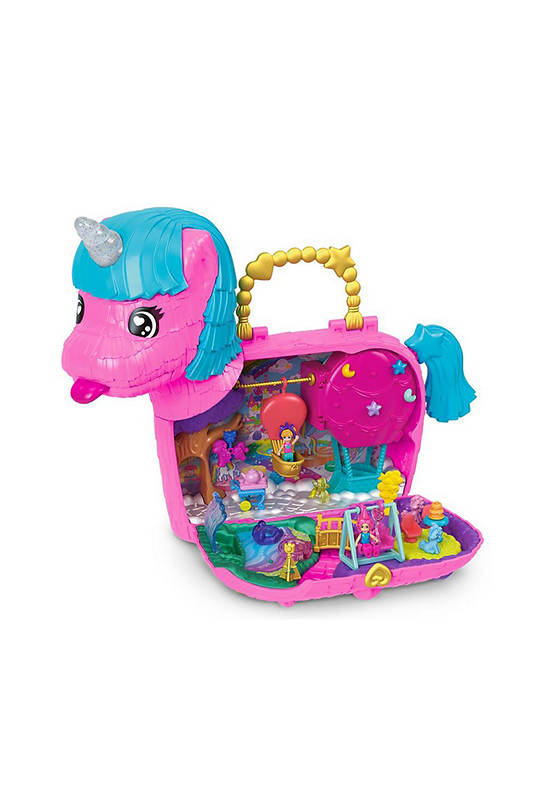 Celebrate Polly Pocket’s 35th Anniversary with the Unicorn Partyland Playset from BARBIE. Get the celebration started with two micro dolls and 25+ accessories, including unicorn pets. This party is poppin’, or should we say poopin»! With two unique ways to discover accessories, kids will love the rainbow ‘puke’ packed bags that fall out of the unicorn mouth and the ‘poop’ of surprise accessories when the tail is lifted! Surprises can be reloaded for repeat fun. The festive unicorn pinata exterior opens to a magical celebration where dolls can go for a ride in a hot air balloon, take turns on the swing, and share a slice of cake in the park. The party never ends with Polly Pocket and friends!