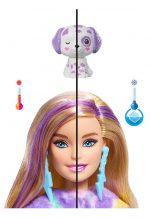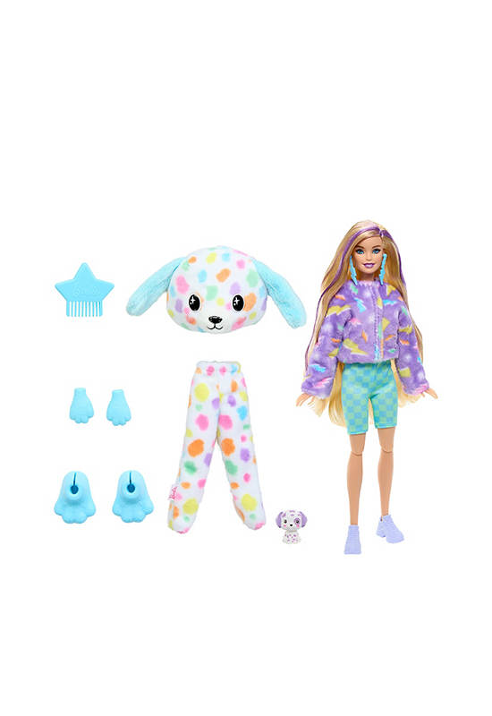 BARBIE with 10 surprises in 1 package, Barbie Cutie Reveal Color Dream Series dolls deliver the cutest unboxing experience with plush friends, fashions and transforming fun! Unbox to find an adorable plush Dalmatian transformed from black and white to a dreamy colorful look featuring a spotted print pattern so cute! Lift the costume head and reveal a Barbie fashion doll with long, blonde hair streaked with purple, posable joints and twinkle-shine shape face details! Open the 4 surprise bags to find fashions and accessories like a pair of shorts, a pair of shoes, earrings, a comb and an adorable matching mini pet! Kids can dress and style Barbie doll by reversing the costume top to find a super-soft fleece jacket with a trendy print. The costume head turns into a bed for the mini pet friend, too! Use icy cold and warm water to transform Barbie doll’s face with twinkle-shine shape details and to ‘open’ and ‘close’ the mini pet’s eyes repeat again and again! Barbie Cutie Reveal Color Dream Series dolls make a great gift for kids 3 to 7 years old,