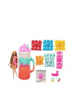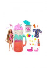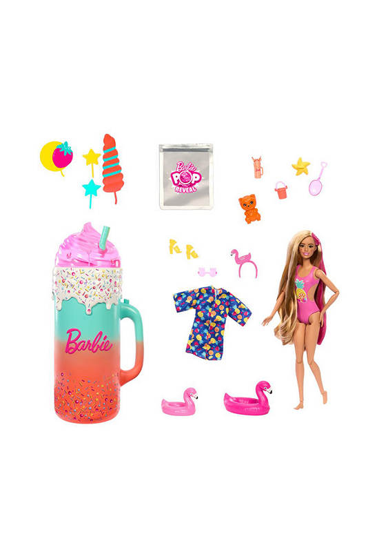 With the Barbie Pop Reveal Rise and Surprise doll and accessories gift set, playtime really pops! Unbox 15 surprises With 15+ surprises in one sweet gift set, Barbie Pop Reveal Rise and Surprise doll and accessories deliver a sensory unboxing experience with fruit-themed fun! Kids remove the outer layer of packaging and press the button on the handle to watch Barbie doll rise to the top like magic she looks refreshing with pink streaks in her blonde hair and a fruit-themed swimsuit Keep unboxing to find a squishy and scented pet, a colorful cover-up and beachy accessories, like a flamingo headband for Barbie doll, sunglasses for the pet and flamingo floaties for both besties Discover additional pieces inside surprise bags and ice cubes that really ‘pop’ open a mini-drink and pair of shoes for Barbie doll; use the cubes for storage or repeat reveals Find even more pieces for storytelling moldable sand, a shovel, bucket and starfish can be used to create unique sand sculptures. Use icy cold water to reveal the doll’s face makeup and warm water to change back for a repeat color-change surprise! Decorate the top of the drink lid with the 4 included toppers, like a strawberry, stars or a candy swirl Filled with surprises and fun, the Barbie Pop Reveal Fruit Series gift set will make a splash with kids 3 years and older