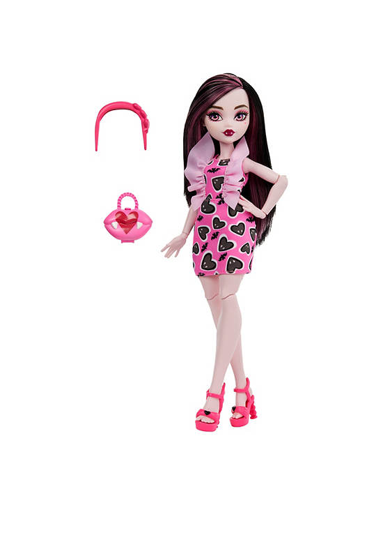 BARBIE Draculaura doll is lurking in surprising ways! This Monster High student makes vampires a statement with her fashion-forward doll outfit, which includes a personalized clutch and spooky-chic accessories. She’s ready to pose stylishly anytime, anywhere with 11 flexible joints. Fully articulated. Doll cannot stand alone. Colors and decorations may vary.