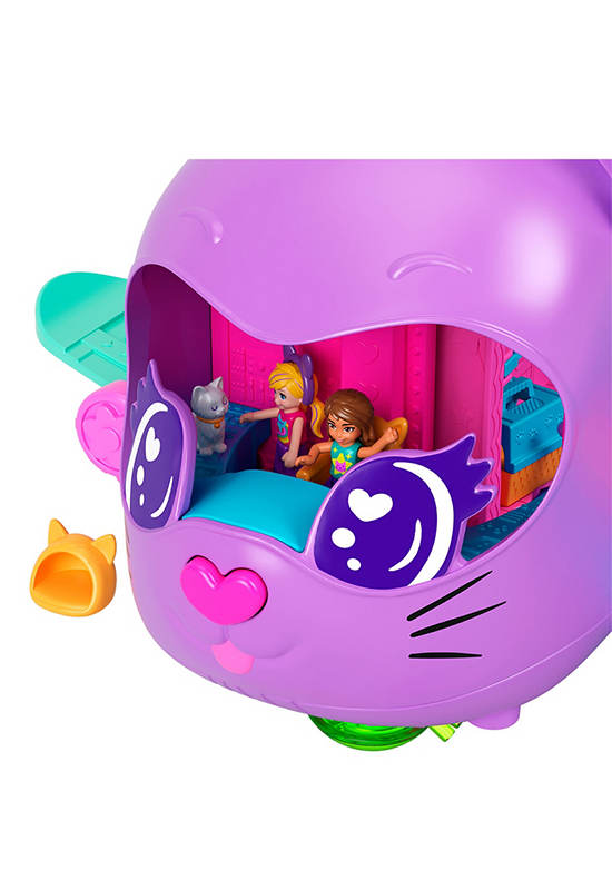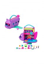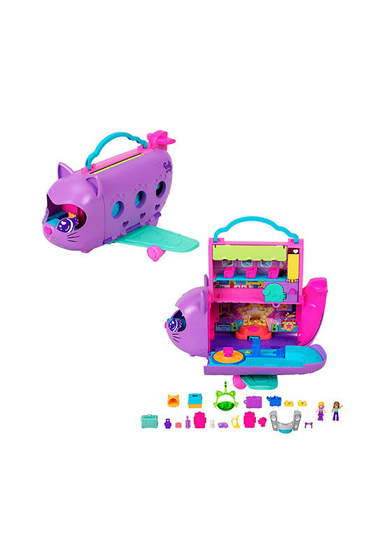 The Polly Pocket Kitty Airways Playset by BARBIE is ready for take-off! With two micro dolls and 19 accessories, imaginations are sure to soar sky high. The adorable kitty plane exterior opens to a multi-level aircraft! Play pilot, passenger, or both! Dolls can stow luggage in one of the overhead bins and take a seat by the window or use the restroom. Buckle up the fun is about to begin! Serve drinks and treats from the snack cart just like a real plane! It’s a party in the main cabin — dolls and pet kitten can perform on the spinning stage before heading to baggage claim. When it’s time to run, fold it up for on-the-go fun! Ideal for ages four years old and up. Colors and decorations may vary.