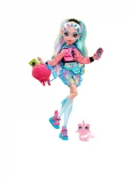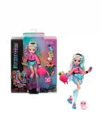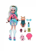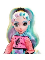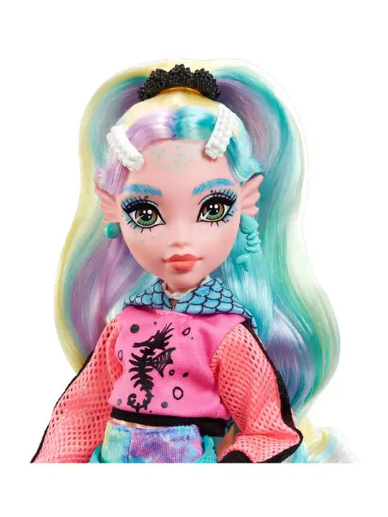 Lagoona Blue doll by BARBIE struts down the Monster High hallways in a fin tastic fashion featuring a hot pink hoodie with mesh sleeves and a trendy, tie dye bike shorts romper. Her gore geous look is complete