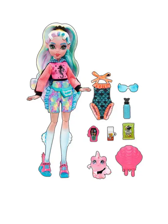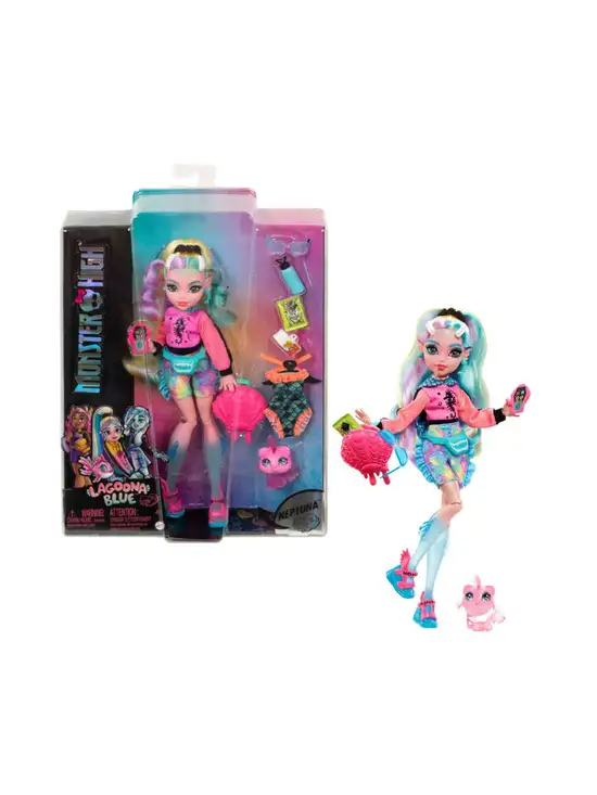 with a sea monster inspired waist bag, seashell backpack, colorblock platform sandals and freaky fabulous fin details inspired by her unique scaritage. Switch up Lagoona Blue doll’s look with a «metallic,» fish scale detailed swimsuit, and inspire spooktacular storytelling with fearsome accessories and her creepy cute pet fish, Neptuna! Doll