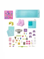 With rolling wheels and a two-seater cab, a kitchen, dining area, sleeping area, bathroom, pool, slide, and den with a TV. with over 60 pieces, including two pet puppies! Kids ages 3 years old and up.
