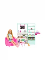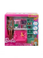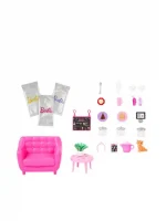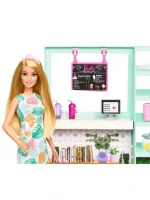 BARBIE Wellness Time For Tea Playset with Doll Enjoy relaxing moments in the cozy cafe with this Barbie doll and playset. Kids can decorate the counter and shelves with accessories, grab a tasty snack, and then pretend to make an herbal tea in the color-changing teapot. This adorable set includes 21 story-telling accessories for hours of fun. Barbie doll wears a pink ribbon in her long blonde hair a charming leaf-print dress and pink ankle boots. Barbie has a cute pet kitten who loves to have fun with her. She can place her order and read a magazine on the sofa and enjoy her drink or become a barista herself and prepare delicious drinks. You can choose the color you want (blue, red, or yellow) and put a spoonful of it in the teapot, causing it to change color. Add water and you can prepare the drink of your choice by combining the colors to create different «tastes». Even the teapot itself changes color when filled with iced water.