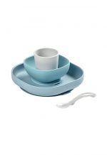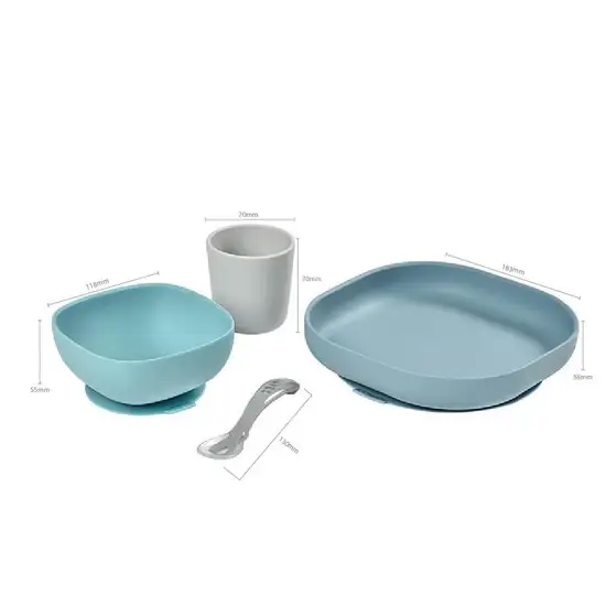 Beaba Silicone Meal Set is a set of plate and bowl that feature suction bottoms to fit any surface, cup and silicone spoon that are ergonomically designed to fit perfectly in little hands.