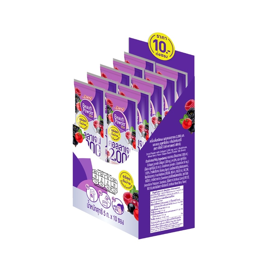 Sappe Beauti Powder Colla-Gluta Stix is a delicious collagen drink powder with a refreshing mixed berry flavor. It contains 2,000 milligrams of collagen and 50 milligrams of L-Glutathione, without any added sugar. It helps nourish the skin and enhance the immune system.