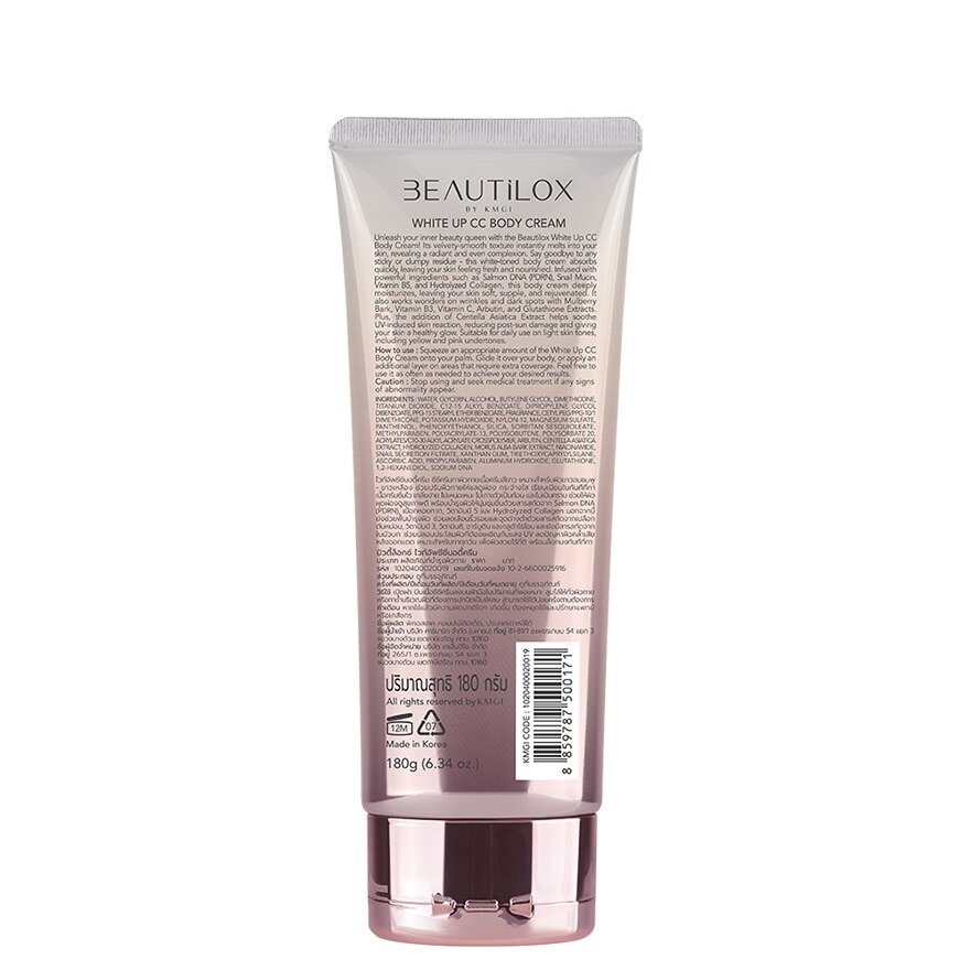 Unleash your inner beauty queen with the Beautilox White Up CC Body Cream Its velvety smooth texture instantly melts into your skin revealing a radiant and even complexion Say goodbye to any sticky or clumpy residue this white toned body cream absorbs quickly leaving your skin feeling fresh and nourished Infused with powerful ingredients such as Salmon DNA Snail Mucin Vitamin B5 and Hydrolyzed Collagen this body cream deeply moisturizes leaving your skin soft supple and rejuvenated It also works wonders on wrinkles and dark spots with Mulberry Bark Vitamin B3 Vitamin C Arbutin and Glutathione Extracts Plus the addition of Centella Asiatica Extract helps soothe UV induced skin reaction reducing post sun damage and giving your skin a healthy glow Suitable for daily use on light skin tones including yellow and pink undertones.