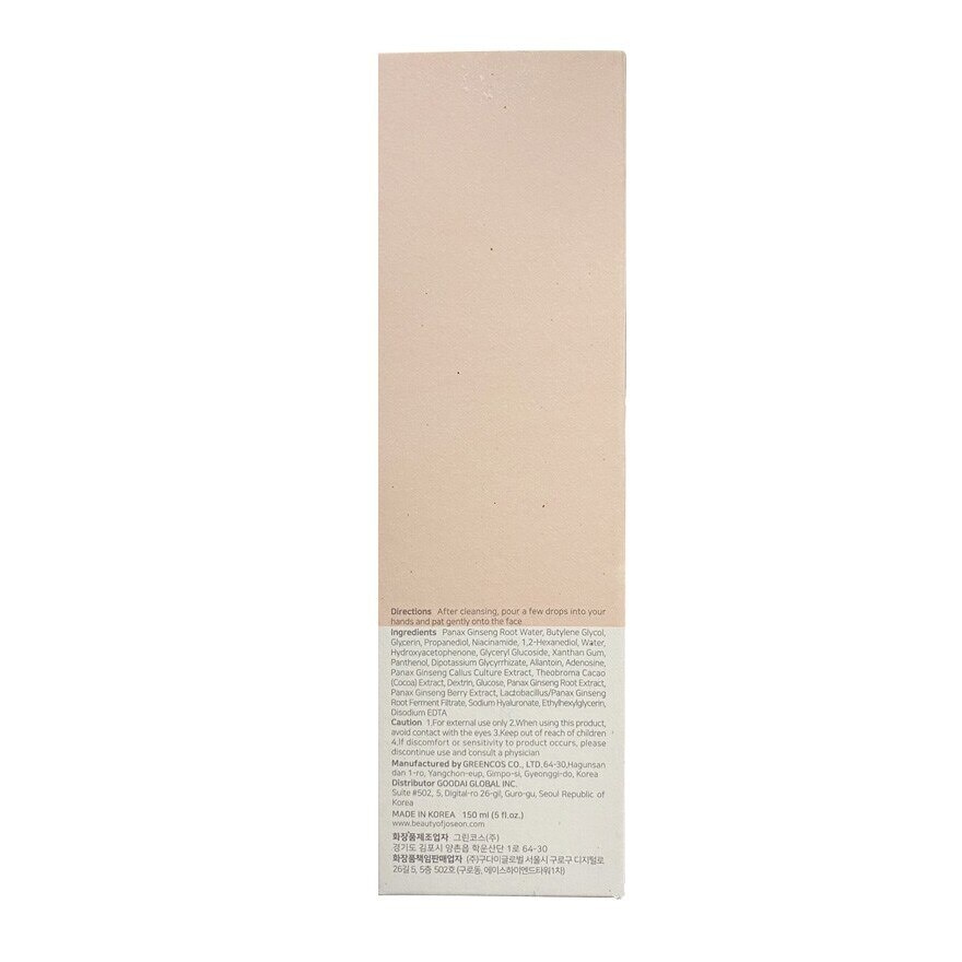 Beauty of Joseon Ginseng Essence Water After cleansing, pour a few drops into your hands and pat gently onto the face. Panax Ginseng Root Water, Butylene Glycol, Glycerin, Propanediol, Niacinamide, 1,2-Hexanediol, Water, Hydroxyacetophenone, Glyceryl Glucoside, Xanthna Gum, Panthenol, Dipotassium Glycyrrhizate, Allantoin, Adenosine, Panax Ginseng Callus Culture Extract, Theobroma Cacao(Cocoa) Extract, Dextrin, Glucose, Panax Ginseng Root Extract, Panax Ginseng Berry Extract, Lactobacillus/Panax Ginseng Root Ferment Filtrate, Sodium Hyaluronate, Ethylhexyglycerin, Disodium EDTA.Ginseng has been a cherished herb in Korean history, renowned for its benefits to our overall health and particularly our skin. Our Ginseng Essence Water, made with 80 ginseng water, harnesses the natural power of ginseng, nourishing and hydrating the skin deeply. This essence not only supplies your skin with ample moisture and nutrients but also ensures long-lasting hydration.