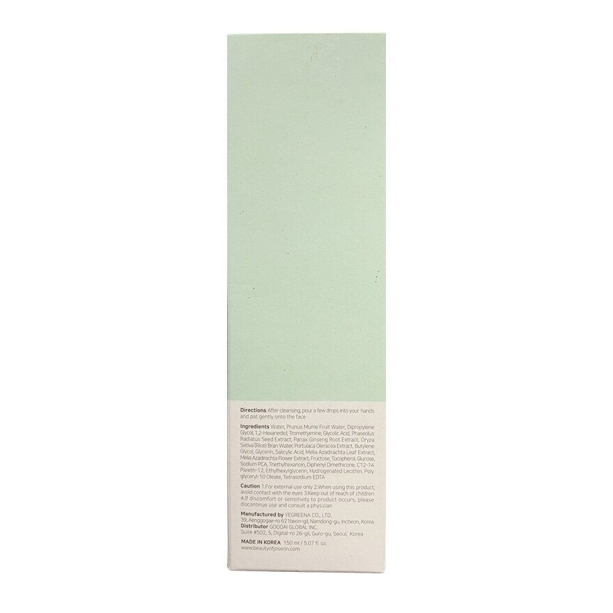 Beauty of Joseon Green Plum Refreshing Toner AHA + BHA After cleansing in the morning and evening, moisten a cotton pad and gently wipe the skin from the inside to the outside. Or, you place a sufficient amount on the palm of your hand and dab lightly to absorb. Water, Prunus Mume Fruit Water, Dipropylene Glycol, 1,2-Hexanediol, Tromethamine, Glycolic Acid, Phaseolus Radiatus Seed Extract, Panax Ginseng Root Extract, Oryza Sativa (Rice) Bran Water, Portulaca Oleracea Extract, Butylene Glycol, Glycerin, Salicylic Acid, Melia Azadirachta Leaf Extract, Melia Azadirachta Flower Extract, Fructose, Tocopherol, Glucose, Sodium PCA, Triethylhexanoin, Diphenyl Dimethicone, C12-14 Pareth-12, Ethylhexylglycerin, Hydrogenated Lecithin, Polyglyceryl-10 Oleate, Tetrasodium EDTA Green Plum Extract Toner Helps remove dead skin cells Gently restores the natural glow to your skin.