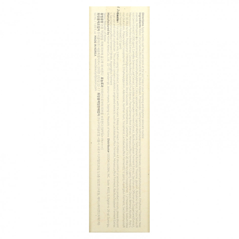 Вода, экстракт риса (Oryza sativa) (30%), дибутиладипат, пропандиол, диэтиламиногидроксибензоил гексил бензоат, полиметилсилсесквиоксан, этилгексил триазон, никотинамид, метилен бис-бензотриазолил тетраметил бутилфенол, кокосовый каприлат/капрат, каприлил метикон, диэтилгексил бутамидотриазон, глицерин, бутиленгликоль, экстракт зародышей Oryza sativa (ледяной) (1000 част. / млн), экстракт листьев зеленого чая (Camellia sinensis), ферментированный экстракт лактобактерий и тыквы, ферментированный экстракт бактерий/соевых бобов, экстракт сахарного тростника (Saccharum officinarum), экстракт морской водоросли (Macrocystis pyrifera), экстракт кокоса (Cocos nucifera), экстракт корня женьшеня (Panax ginseng), фермент из монаска / риса (0,12 част. / млн), пентилен гликоль, бегениловый спирт, поли c 10-30 алкил акрилат, полиглицерил-3 метилглюкозы дистеарат, децил глюкозид, трометамин, карбомер, акрилат/c10-30 алкил акрилат кроссполимер, 1,2-гександиол, натрия стеароил глутамат, полиакрилата кроссполимер-6, этилгексилглицерин, аденозин, ксантановая камедь, токоферол, лактобактерии / фермент риса (0,12 част. / млн), фермент аспергилла, сахаромицеты / фильтрат ледяной ферментации (0,12 част. / млн).