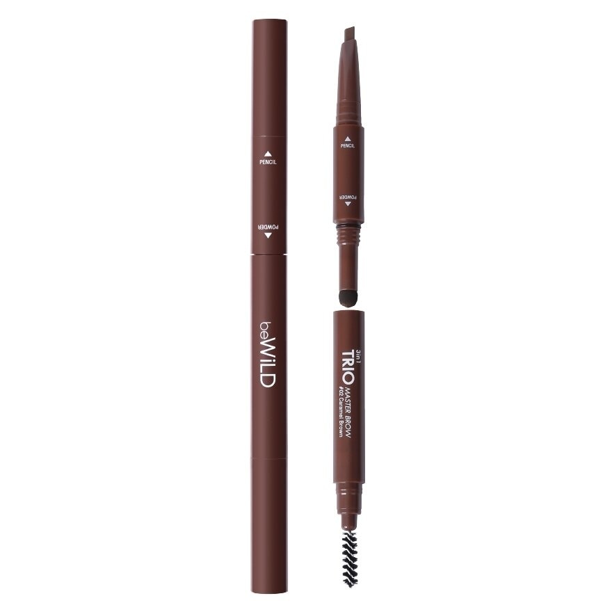 beWiLD 3in1 Trio Master Brow. Sculpt, shape and design the perfect brows. This pencil helps to create beautiful eyebrows with 3 functions. Twist-up pencil, powder tip and spoolie brush. Triangle tip shape features both curves and sharp angles then naturally fill in the brows with powder and use the spiral brush included to assist with brow grooming. Easily create 3 Dimensional brows with this soft and creamy formula, from natural boy brows to dramatic arches, this 3in1 Trio Master brow helps create the look that you want. Highly pigmented too ensure easy to fill and long lasting.