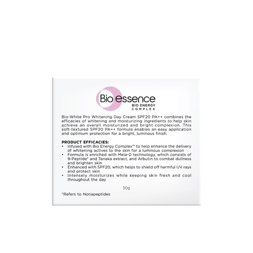 Bio-essence Bio-White Pro Whitening Day Cream SPF20 PA++ Combines the efficacies of whitening and moisturizing ingredients to help skin achieve an overall moisturized and bright complexion. This soft-textured SPF20 PA++ formula enables an easy application and optimum protection for a bright, luminous finish. Infused with Bio Energy Complex to help enhance the delivery of whitening actives to the skin for a luminous complexion. Formula is enriched with Mela-D technology, which consists of 9-Peptide and Tanaka extract, and Arbutin to combat dullness and brighten skin. Enhanced with SPF20, which helps to shield off harmful UV rays and protect skin. Intensely moisturizes while keeping skin fresh and cool throughout the day