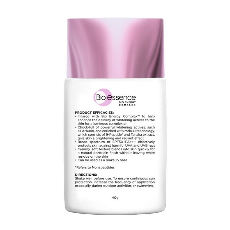 Bio-essence Bio-White Pro Whitening Sunscreen SPF50+PA+++ infused with Bio Energy Complex to help enhance the delivery of whitening actives to the skin for a luminous complexion. Chock-full of powerful whitening actives, such as Arbutin, and enriched with Mela-D technology, which consists of 9-Peptide and Tanaka extract, give skin a brightening and radiant effect. Broad spectrum of SPF50+PA+++ effectively protects skin against harmful UVA and UVB rays. Creamy, soft texture blends into skin quickly for a natural porcelain finish without leaving white residue on the skin