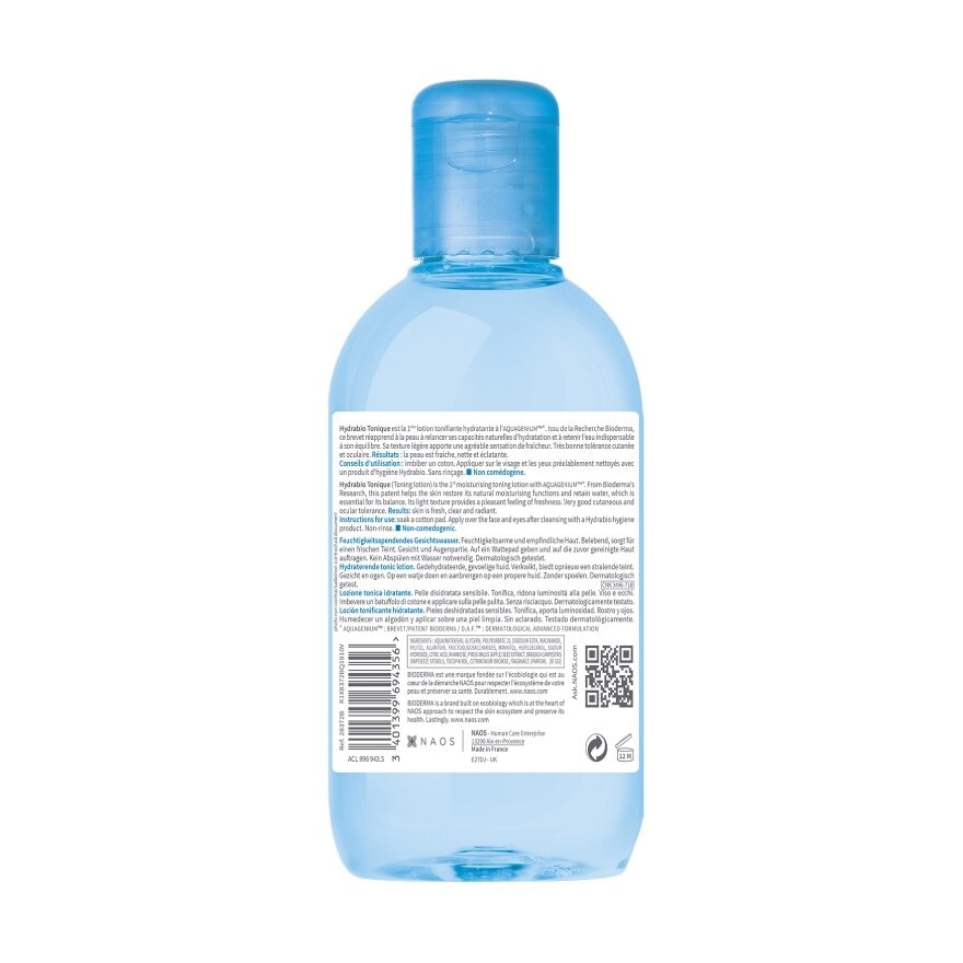 Bioderma Hydrabio Tonique Moisturising Toning Lotion for Dry and Sensitive Skin A moisture-generating moisturizing toning lotion for for dehydrated skin. Super hydrates, tones & soothe. Help produces a sensation of freshness. Leaves the skin toned and moisturized after make-up removal. Retrains the skin to activate its natural moisturizing capacities by stimulating the production of aquaporins, water channels in the skin, and retain the water it needs to be balanced. Fluid, lightweight texture. Allergen-free. Fragrance. Non-comedogenic. Hypoallergenic. Every day, pollution, stress, cold weather can altered skin appearance. As a result, it becomes dehydrated, tight and uncomfortable and loses its radiance. Developed in the Bioderma Research laboratories, the Aquagenium patent found in Hydrabio Tonic Lotion helps to improve the natural moisturizing capacities of the skin.