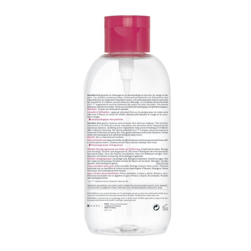Bioderma Sensibio H2O A cleansing and make-up removing water that respects the fragility of sensitive skin.Combines performance and very high tolerance for skin and perfectly cleanses and removes make-up from the face and eyes. Produces a feeling of instant freshness, soothes and clears up irritated skin. A cleansing and make-up removing water that respects the fragility of sensitive skin thanks to its non-aggressive formula. Micelles act like magnets and remove all impurities from the skin, leaving it clean and soothed. BIODERMA has acquired unique expertise by placing biology at the service of dermatology. This original scientific approach relies first and foremost on the skin's knowledge and its biological mechanisms to formulate its products 'Packaging made from Recycled plastic'