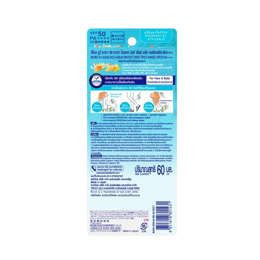 Biore UV Aqua Rich Aqua Protect Mist Spice Magic SPF50 PA++++ New type of sunscreen with light mist texture. Protect skin throuroughly from head to toes as another skin and very water resisitant. Finish skin look dewy with Spice Magic scent. Feel of fresh fruity and bautiful flowery together with the sunlight will fullfil your day and ready to enjoy all actities. Let’s take a step with spice magic. — Quick absorb, long-lasting and very water resistant — Allergy Tested — Non-Comedogenic Tested — Easy to use, no need to shake — Can spray upside down — No gas, so no gas sound when spray — Can be used on hair. Biore UV Aqua Rich Aqua Protect Mist Spice Magic SPF50 PA++++ New type of sunscreen with light mist texture. Protect skin throuroughly from head to toes as another skin and very water resisitant. Finish skin look dewy with Spice Magic scent. Feel of fresh fruity and bautiful flowery together with the sunlight will fullfil your day and ready to enjoy all actities. Let’s take a step with spice magic.