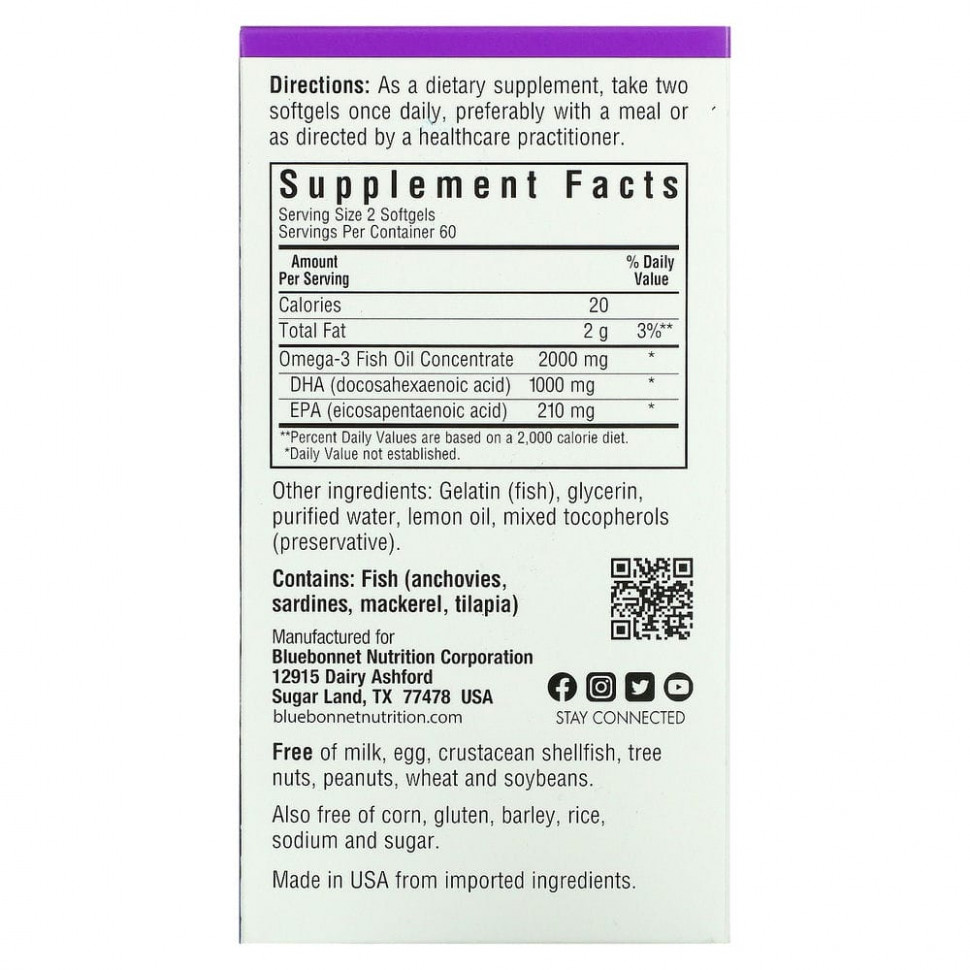 Капсулы с омега-3 из рыбьего жира для здоровья мозга от Bluebonnet’s содержат специальное соотношение ЭПК и ДГК из ультраочищенных кислот омега-3 из рыбы дикого улова, способствующих поддержанию в пределах нормы работы мозга, хорошего настроения и концентрации.
