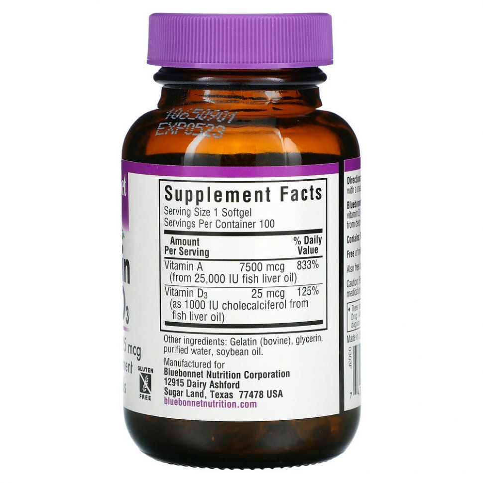 Капсулы Bluebonnet содержат витамин А и витамин D3 (холекальциферол), которые способствуют здоровому зрению и крепкому иммунитету. Их получают из жира печени глубоководных, холодноводных рыб путем молекулярной дистилляции.