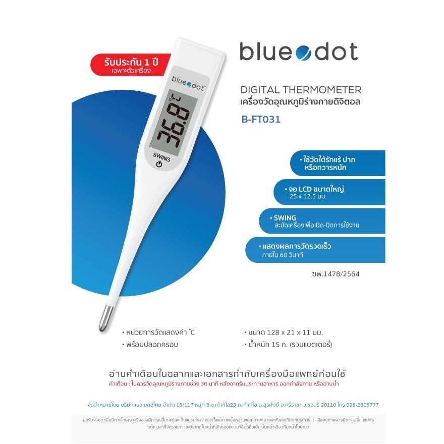 BLUEDOT B-FT031 DIGITAL THERMOMETER Easy to read difital LCD (Liquid crystal display). Compack, accurate and durable LSI (Large scale integration) device. Temperatures can be taken under the tongue (oral use) or under the arm (axillary use). It is suggested that rectal temperatures be taken on infants only when axillary use is inconvenient. Very sensitive device, quick to obtain results. Small, lightweight unit (15 grams). Universal use for the whole family. Especially ideal for children. Last temperature memory recall. ABS resin body presents no hazard compared to broken mercury glass thermometers.