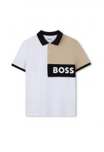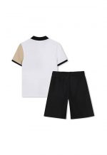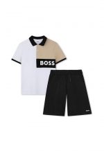 BOSS KIDS This is a stylish and sporty set for children, featuring a modern color-blocked polo shirt and comfortable shorts. The recognizable BOSS logo adds a touch of branding. The set is likely designed for casual wear or sports activities.