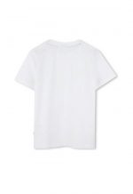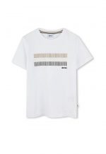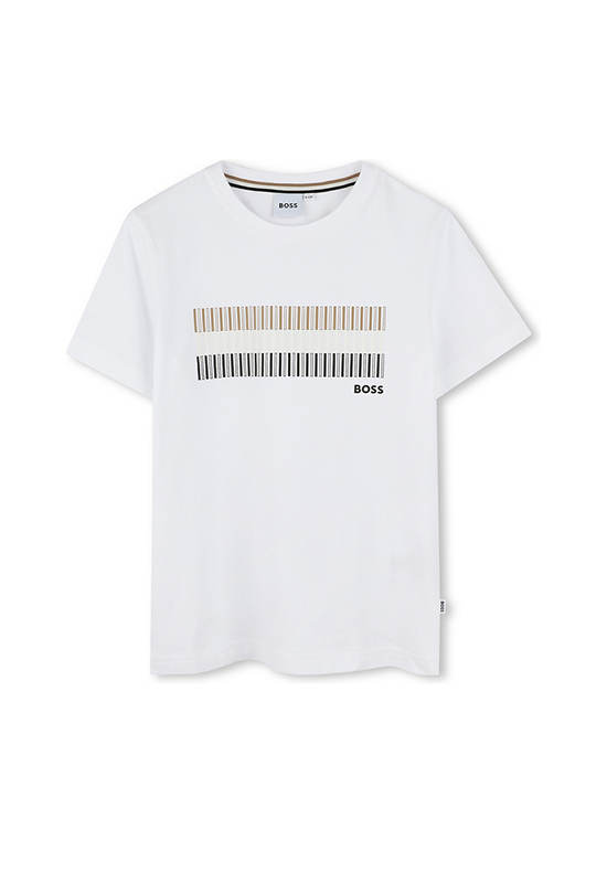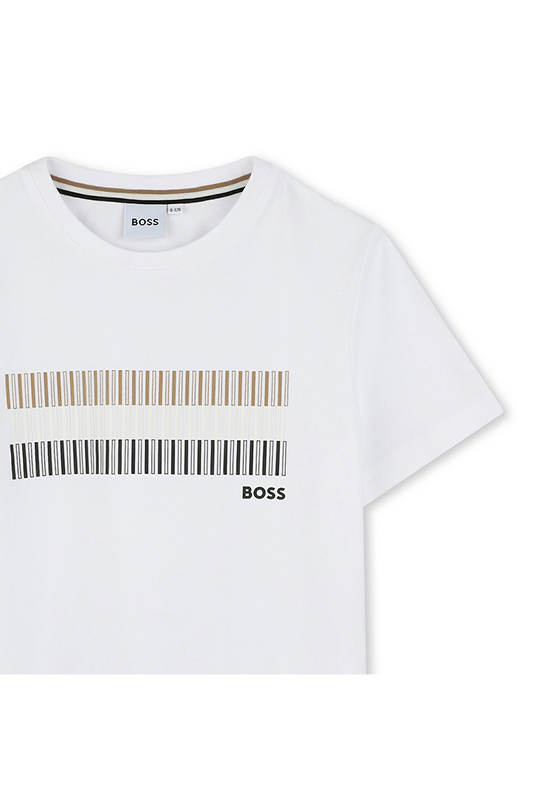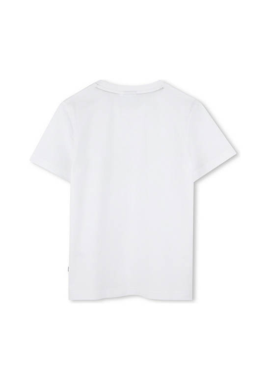 BOSS KIDS This is a simple and stylish t-shirt for children, featuring a modern graphic design across the chest. The clean white color makes it a versatile piece that can be easily paired with other items.