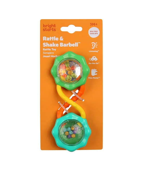 BRIGHT STARTS Barbell Rattle keeps your little kid entertained as enhances child development and learning skills.