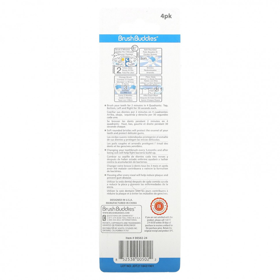 Упаковка из 4 детских зубных щеток с мягкими щетинками, которые не нуждаются в подставке благодаря двум маленьким присоскам в нижней части каждой щетки. Начинайте и заканчивайте свой день с улыбкой!