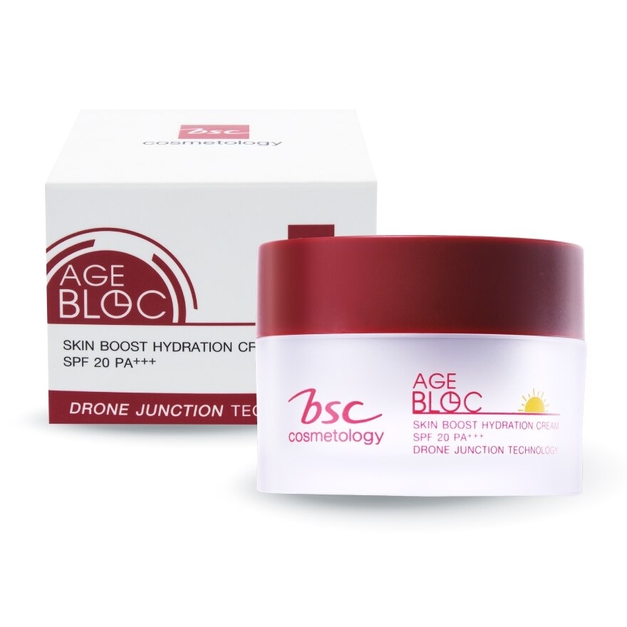 BSC Age Bloc Skin Boost Hya Cream 30g This is light feel moisturizing day cream SPF20 which contains high effective sunscreen agents that help to protect the skin from sunburn and the signs of aging from the damaging effects of UVB and UVA rays It works with the new technology to deliver active ingredients to skin which is Drone Junction providing skin firmness and smoothness improvement Moreover it contains Skin Defensil Vitamin C and Vitamin E which provide healthy and radiant skin Can be used on a daily basis.