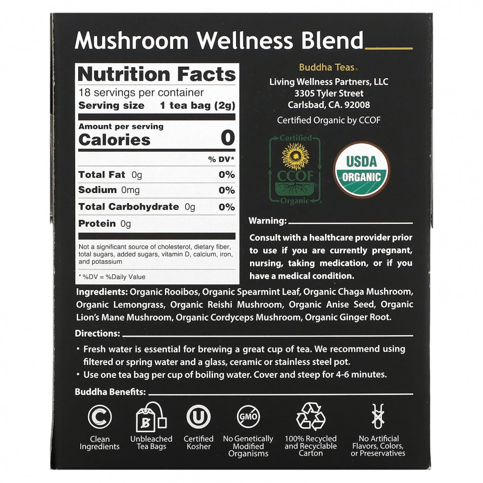 Органический ройбуш, листья органической мяты колосистой, органический гриб чага, органический лемонграсс, органический гриб рейши, органические семена аниса, органический гриб львиная грива, органический гриб кордицепс, корень органического имбиря.