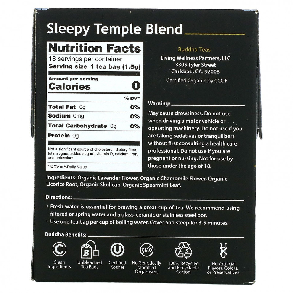 Комфорт и спокойствие сочетаются в этом эксклюзивном чае перед сном. Наша смесь Sleepy Temple сочетает в себе чарующие цветочные ноты ромашки, лаванды и тюбетейки, с правильным оттенком листьев мяты и важнейшей гармонизирующей травы — солодки. Обладает успокаивающим и сбалансированным вкусом, подходит для употребления непосредственно перед сном.