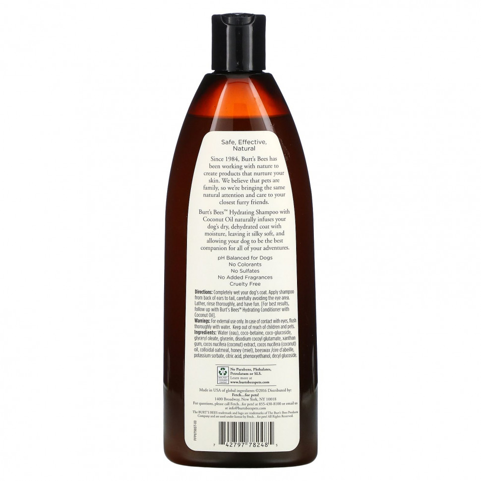 Увлажняющий шампунь Burt’s Bees ™ с кокосовым маслом естественным образом наполняет сухую обезвоженную шерсть вашей собаки влагой, делая ее шелковистой и мягкой, и позволяет вашей собаке быть лучшим компаньоном во всех ваших приключениях.