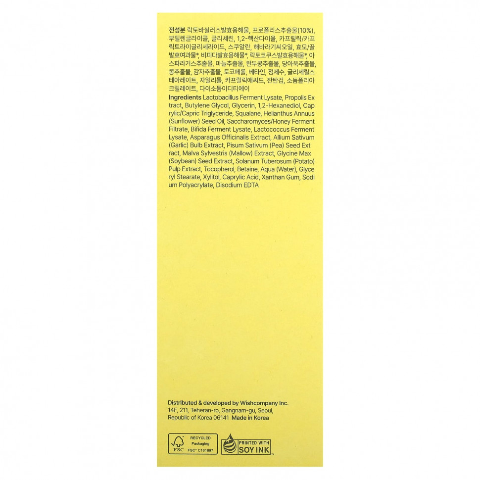 Ферментный лизат лактобактерий, экстракт прополиса, бутиленгликоль, глицерин, 1,2-гександиол, каприловый/каприновый триглицерид, сквалан, подсолнечное масло (Helianthus annuus), продукт ферментации дрожжевых грибков-сахаромицетов / меда, лизат ферментов бифидобактерий, лизат ферментов лактококка, экстракт спаржи лекарственной, экстракт луковиц чеснока (Allium sativum), экстракт семян гороха посевного (Pisum sativum), экстракт мальвы (Malva sylvestris), экстракт соевых бобов (Glycine max), экстракт корнеплода картофеля (Solanum tuberosum), токоферол, бетаин, вода, глицерил стеарат, ксилитол, каприловой кислоты, ксантановая камедь, полиакрилат натрия, двунатриевая ЭДТК.
