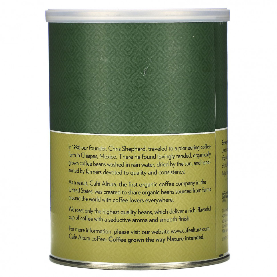 Кофе Cafe Altura органически выращивается на высотах от 900 метров на небольших семейных фермах по всему миру. Кофе растет в своем естественном цикле. При выращивании и обработке Cafe Altura Organic Decaffeinated Coffee никогда не используются химические удобрения и пестициды. Мы используем горную воду, размачивающую кофейные зерна, насыщающую зерна ароматом в нагретой воде. Затем мы пропускаем кофе через фильтры из активированного угля, удаляя кофеин и сохраняя аромат. В итоге мы получаем кофе с богатым ароматом, из которого удалено 97% кофеина. Этот процесс одобрен для органического кофе министерством сельского хозяйства США и Stellar Certification.