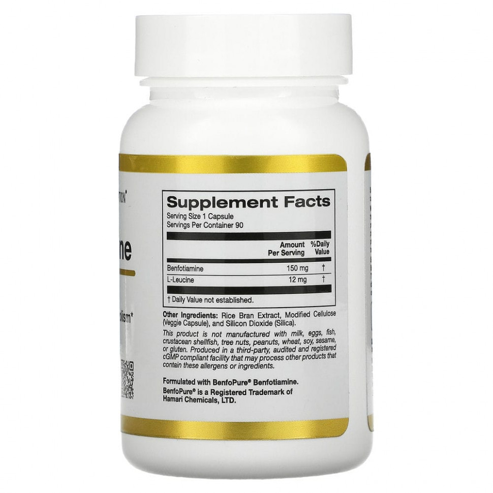 Бенфотиамин от California Gold Nutrition представляет собой BenfoPure® и L-лейцин в растительных капсулах. При приеме согласно рекомендациям одной упаковки достаточно на три месяца.