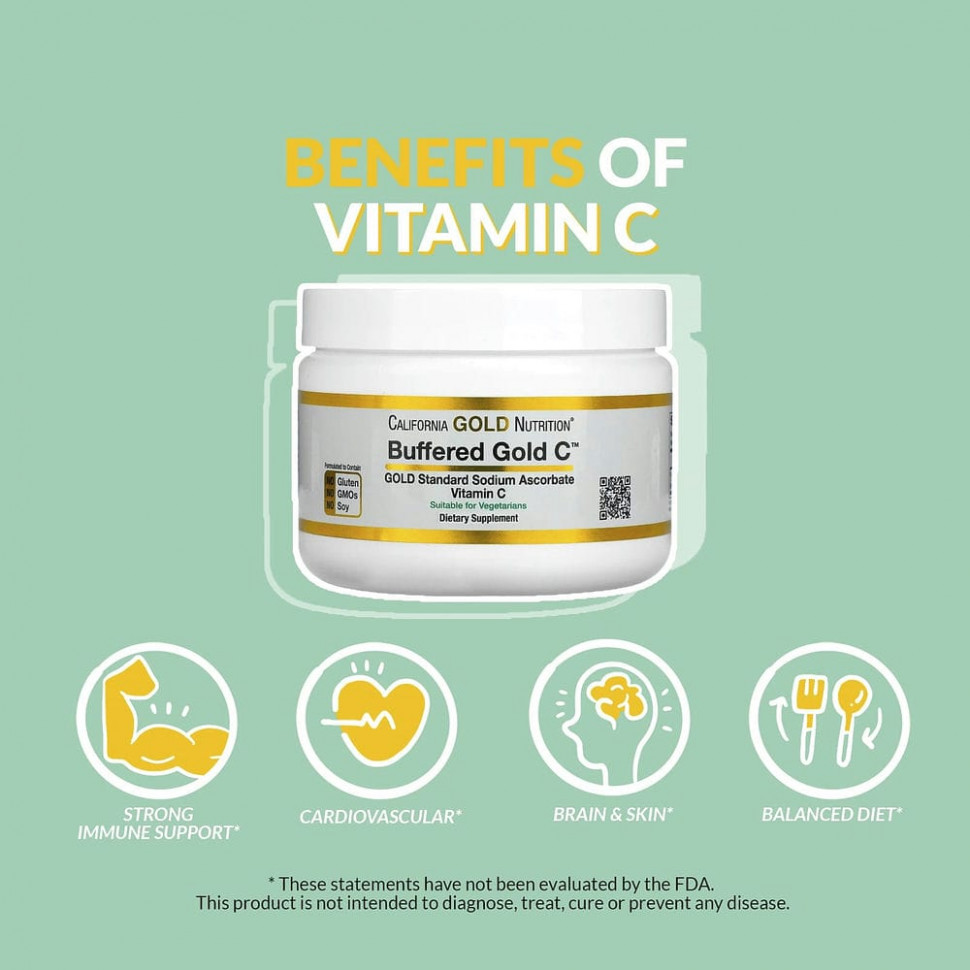 Buffered Gold C™ от California Gold Nutrition представляет собой некислую форму витамина С в форме аскорбата натрия. Буферизованный витамин С в форме порошка — это простой и экономичный способ получить индивидуальную дозу витамина С для людей с чувствительной пищеварительной системой. Buffered Gold C™ можно смешивать с водой, соком или другими напитками.