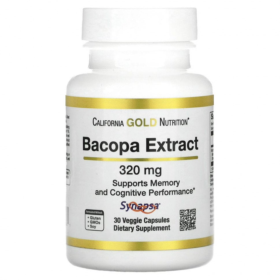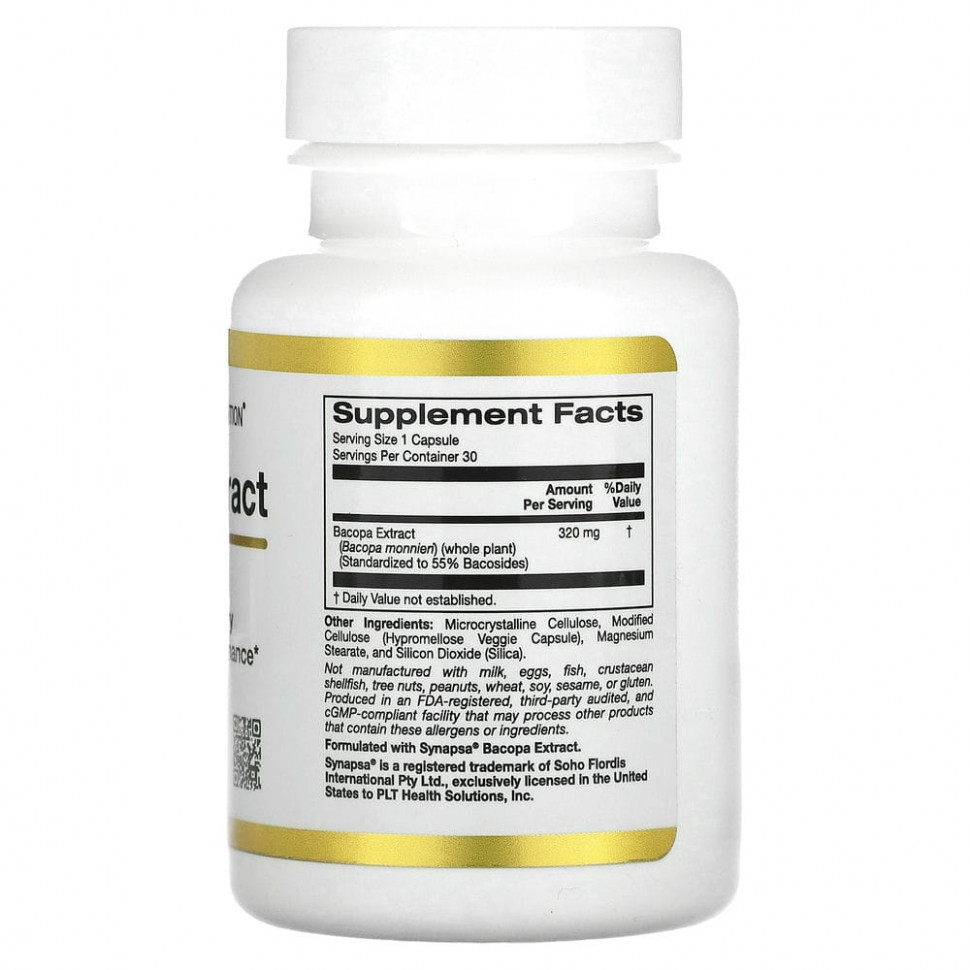 Экстракт бакопы California Gold Nutrition содержит Synapsa®, запатентованный и стандартизированный экстракт из цельного растения бакопы Монье. Он подходит для вегетарианцев и веганов и не содержит глютена, ГМО и сои. Одна упаковка рассчитана на прием в течение одного месяца (при соблюдении рекомендаций).